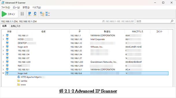 ネットワーク全体をスキャンし、接続されている機器のIPアドレスMACアドレスホスト名