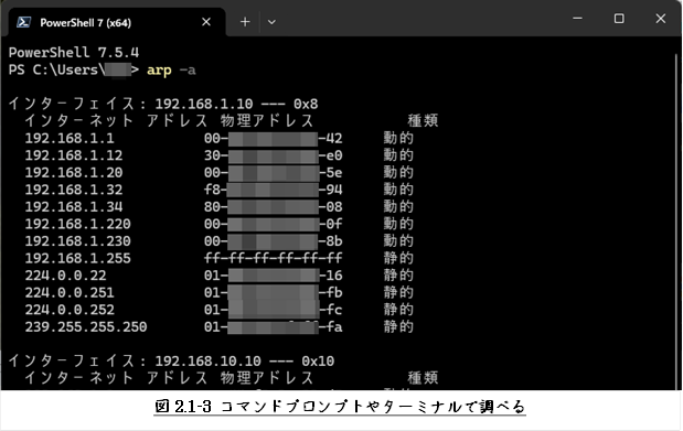 2.1-3項で示す“arp -a”コマンドよりも現在の状況を正確に把握しやすいです。