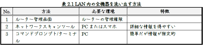 LAN内の接続されている機器を洗い出す方法を、表2.1-1に示します。