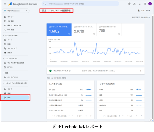robots.txtファイル、前回のクロール日、発生した警告やエラーが表示されます。