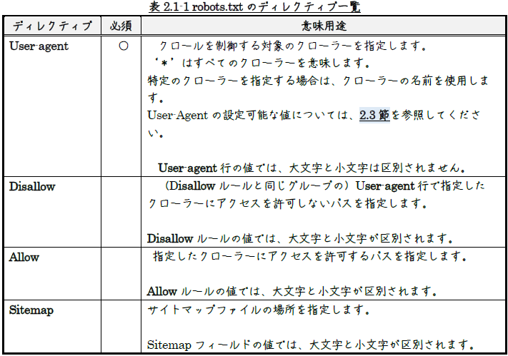 robots.txtには、表2.1-1に 示すようなディレクティブがあります。