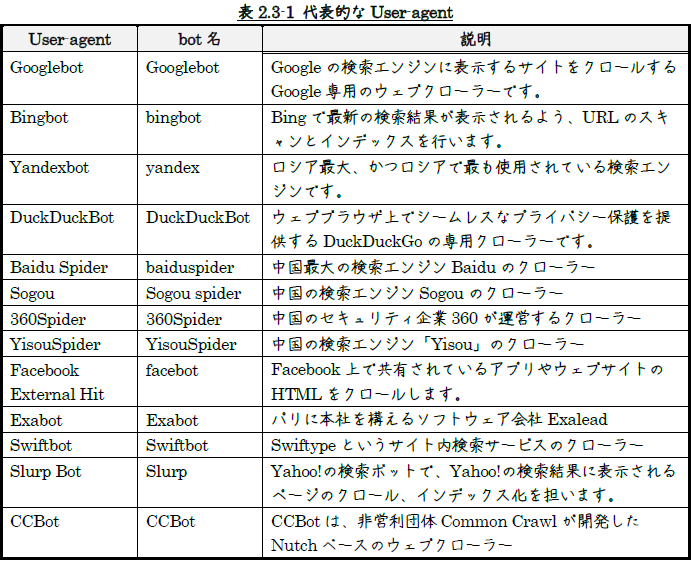 表2.3-1に代表的なUser-agentを示します。