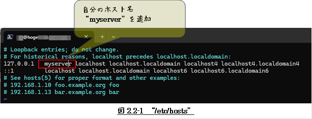 2.2.1 “hosts”ファイルのローカルホスト行に、自分のホスト名を追加