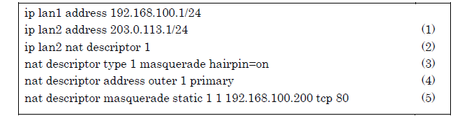 なら、ヘアピンNAT機能を追加するには、(3)、(4)のコマンドを実行するだけとなります。