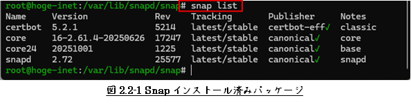 インストール済みのパッケージは、“snap list”コマンドで確認することができます。