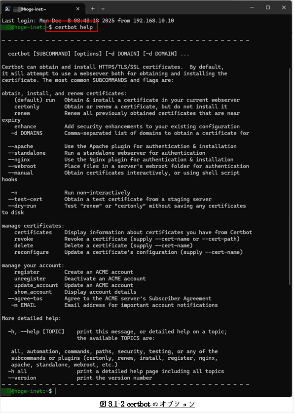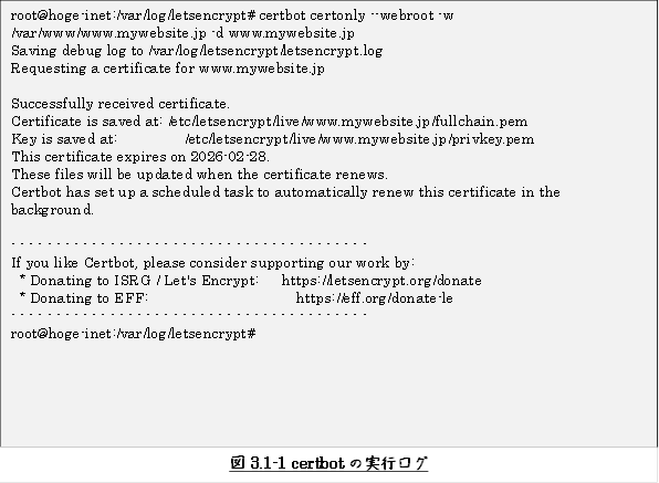 これで証明書の発行は終了です。 参考として、図3.1-1にcertbotの実行例を示します。