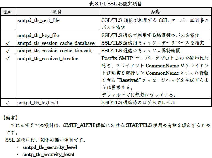 表最左欄の項目は、“main.cf”ファイル中にサンプル記述がないため、新規の追加項目となります。