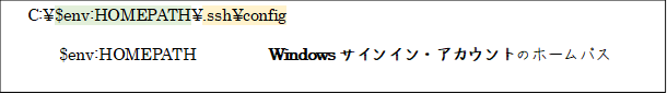 7.X系のWindows PowerShell SSHの“ssh_config”と全く同じものを共有することができます。
